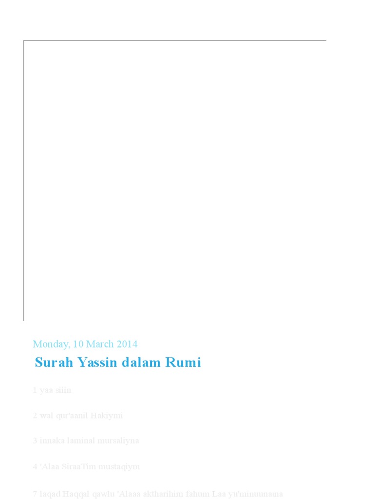 Surah Yasin Rumi : Bacaan Doa Qunut Rumi Dan Jawi 1 - Doa Harian - Surah yang digalakkan untuk dibaca.. We would like to show you a description here but the site won't allow us. Kelebihan membaca surah yasin 1. Surah yang digalakkan untuk dibaca. Daripada abi ja'far muhammad bin ali berkata: Barangsiapa yang mendepati hatinya keras, maka tulislah ayat يس وَالقُرْءَانِ di dalam bekas perak yang dicampur dengan za'faran, kemudian minumlah airnya.